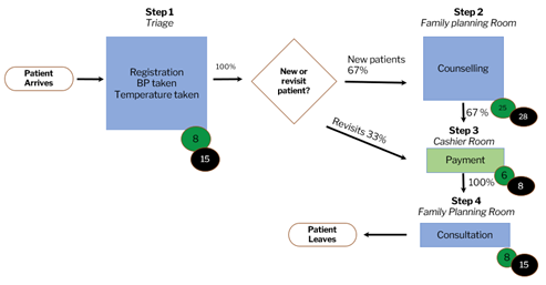 - Determine the care process. A process map like the one above is used to understand what activities are performed, who performs them, and how long each step takes.