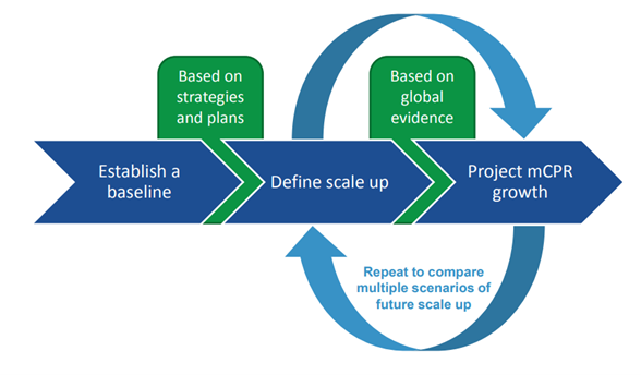 Program planners can utilize FP Goals to model scale-up and implementation of new programs. Based on the scale of interventions in these programs (how many people the intervention is anticipated to reach), baseline coverage is estimated. FP Goals then uses global evidence on the effectiveness of various types of FP interventions to project the impact of increases in coverage on the growth in the modern contraceptive prevalence rate (mCPR).