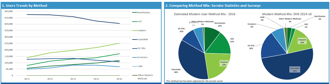 The two graphs above are examples of how service statistics data is reviewed for quality. The first graph illustrates the number of users that have been estimated by method, based on the service statistics data input. The second set of graphs compares the estimated method mix based on the service statistics data compared to the last survey. These two graphics are reviewed to sense check the data – are trends in individual methods reasonable given current programmatic efforts – and look for any indications of errors – is the method mix substantially different than was found in a recent survey? If so Is there any reasonable explanation or could this indicate an error in the data?