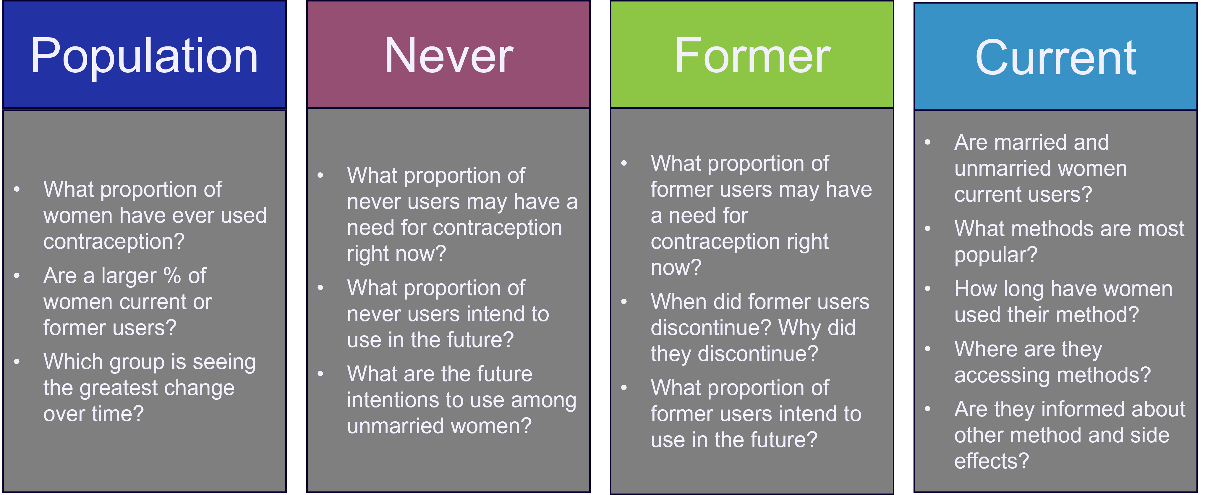 From Current Users, or those women who are currently using a method of contraception to prevent pregnancy, we can understand who is using, what methods are available, service quality, and source among other things - helping to improve our understanding of the services being provided and clients whose needs are being met.