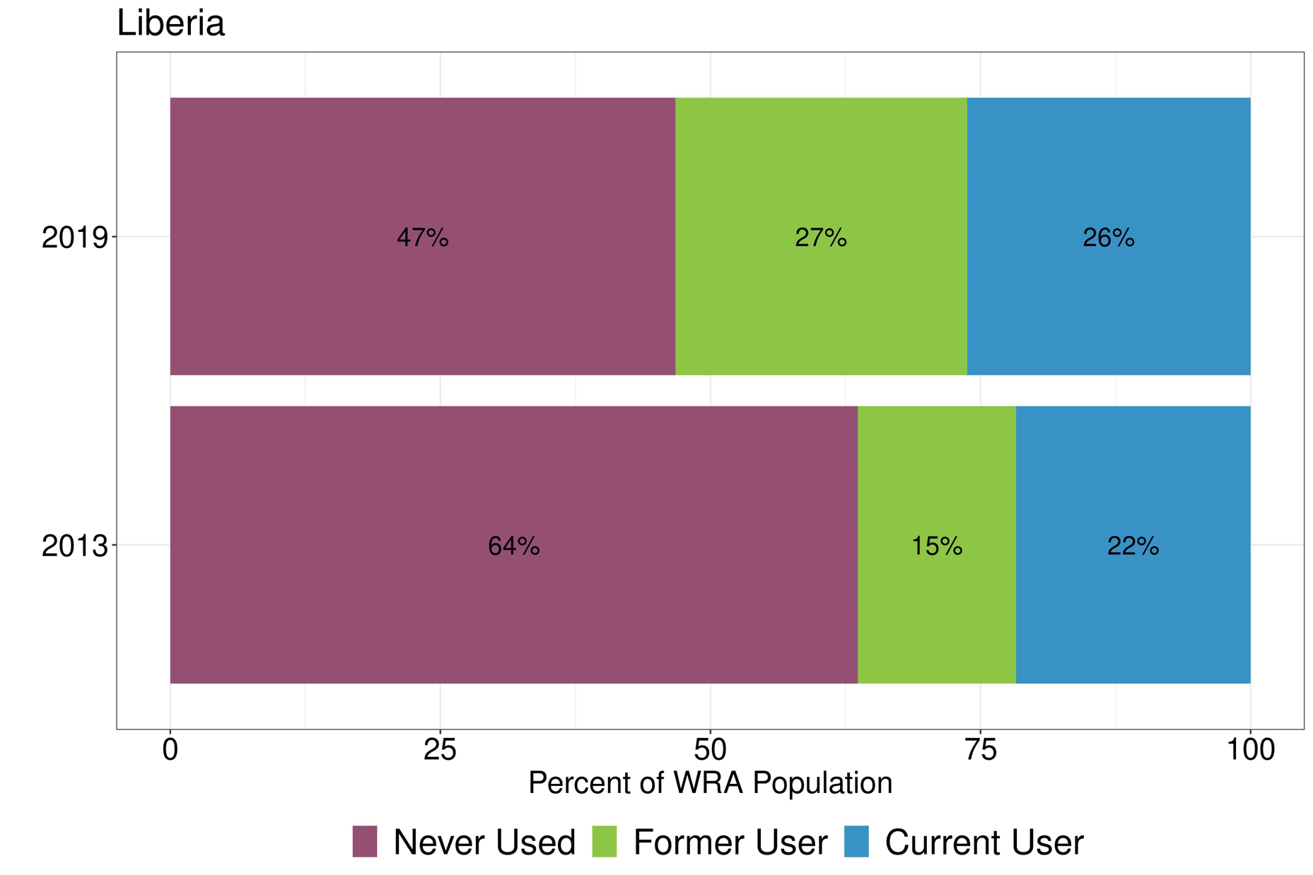Changes over time in the distribution of women between these groups can help demonstrate progress that isn’t visible when looking only at mCP or current use. The combination of “Current” and “Former” users represents “Ever Use” or the proportion of women who have ever used a contraceptive method. Growth in ever use over time can demonstrate expansion in availability and acceptability of contraception and growth in ever use driven by former use can signify an increase in birth spacing.