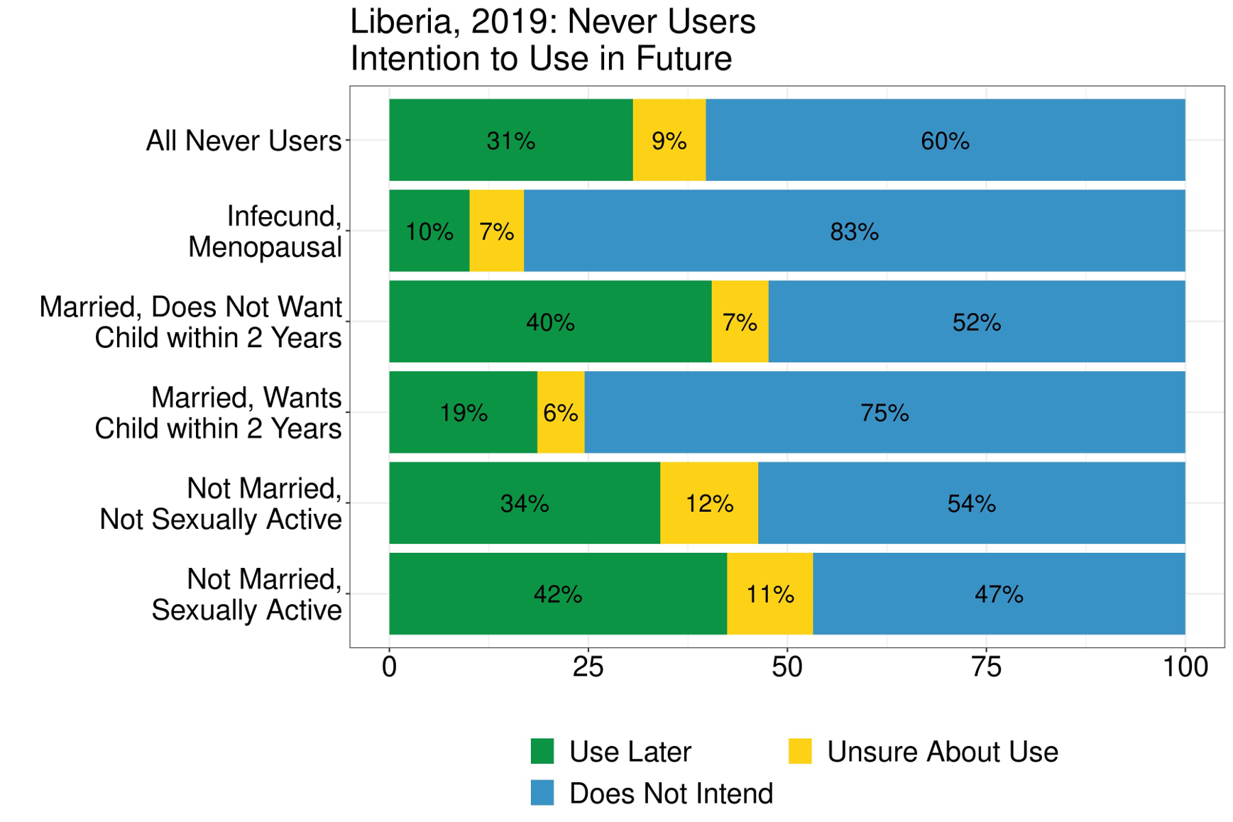 Never Users, or those women who have never used a method of contraception in their lives, can help us understand potential barriers to contraceptive use and the scale of potential growth. Understanding who makes up this group, whether they may have a current or future need for contraception, and whether they intend to use in the future can help in designing programs to meet their needs – women who have never used contraception likely need different messaging and have different barriers to use than those who have formerly used.
