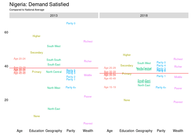 In an effort to examine inequity in family planning through many lenses, Track20 explores demand satisfied for modern methods through five dimensions (age, education, geography, parity, and wealth), mapping inequities within countries and across time. Creating a “Concentration of Inequity” highlights the intersectionality of inequities in family planning and allows for more data informed programming. The tool shows demand satisfied at the national level and defines inequitable groups as subsets of the population with demand satisfied either 10%, 20%, or 30% below the national average. The Equity Tool is pre-loaded with data to display multiple aspects of inequity for countries with a Demographic Health Survey since 2012 through engaging data visualizations.