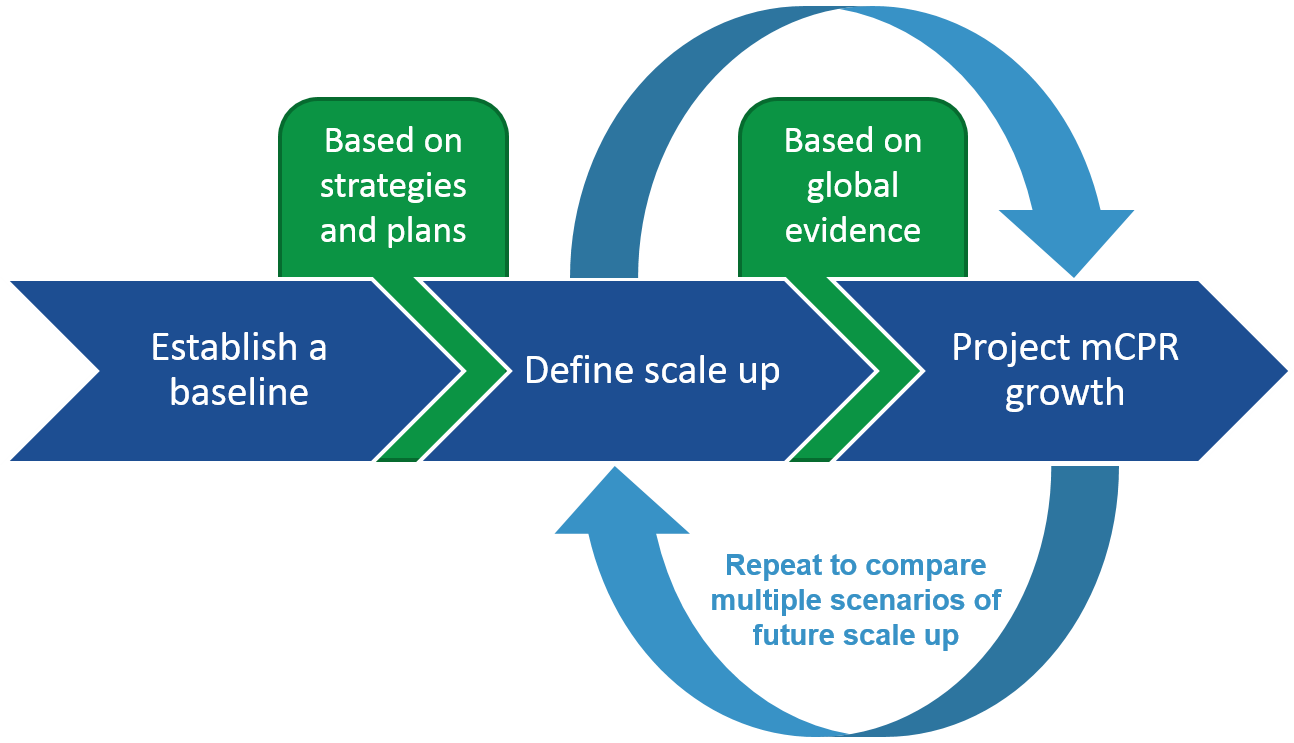 - This process of defining scale-up and projecting mCPR growth is repeated to provide multiple scenarios, with varying levels of scale-up of existing programs and various options for implementation of new programs.