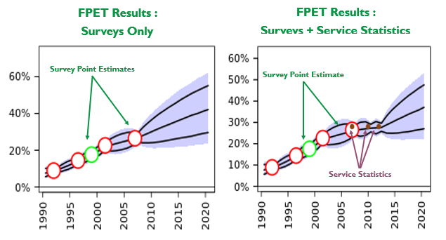 The EMU values produced by the SS to EMU Tool can be entered in FPET along with Survey results in order to inform estimates of mCPR. Incorporating the service statistics data can improve estimates in years beyond the last survey, informing the trend with more recent data as well as narrowing the confidence interval around the estimates. See the graphs below: