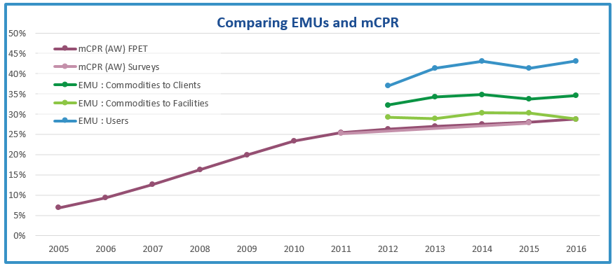 The EMU can also be used as an input into the Family Planning Estimation Tool (FPET), which calculates estimates for current and future mCPR, based on a variety of data sources. Inputting the EMU allows FPET to consider service statistics in its calculation of estimated mCPR, unmet need and demand satisfied by modern, and can play an important role in recognizing changes in trends between surveys. Service statistics data is generally available on an annual (and even monthly) basis and can provide the model with additional data on changes in prevalence after the last survey. This is especially useful in cases where survey data may be outdated or where dramatic social changes or expansions in family planning programming have occurred since the last survey.