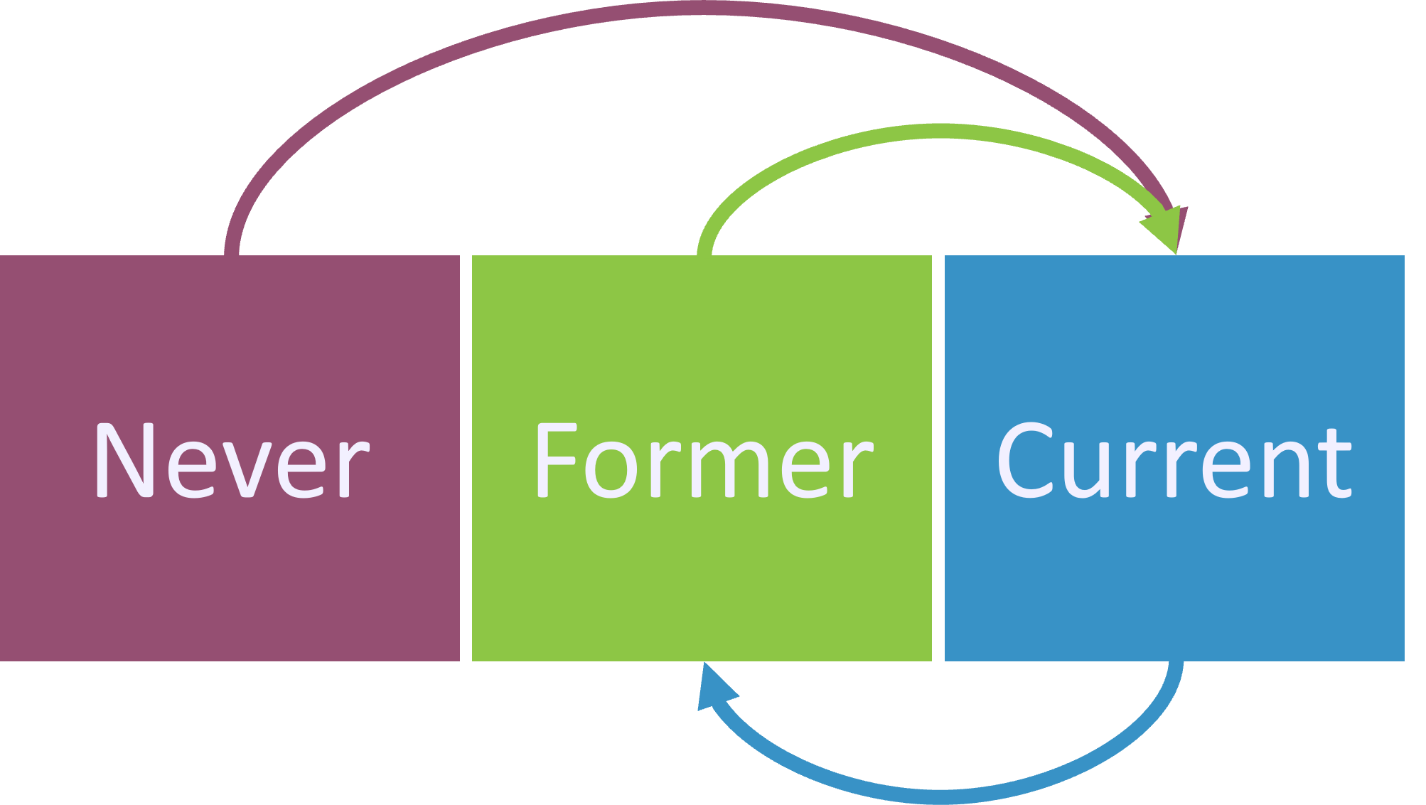 - All women start their reproductive lives as never users of contraception. Some use FP and become current users. They discontinue, becoming former users, until they start a new method.