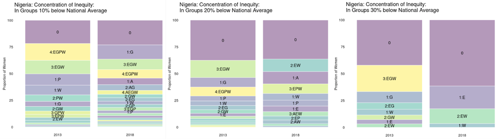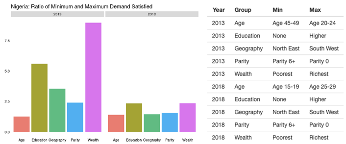 In an effort to examine inequity in family planning through many lenses, Track20 explores demand satisfied for modern methods through five dimensions (age, education, geography, parity, and wealth), mapping inequities within countries and across time. Creating a “Concentration of Inequity” highlights the intersectionality of inequities in family planning and allows for more data informed programming. The tool shows demand satisfied at the national level and defines inequitable groups as subsets of the population with demand satisfied either 10%, 20%, or 30% below the national average. The Equity Tool is pre-loaded with data to display multiple aspects of inequity for countries with a Demographic Health Survey since 2012 through engaging data visualizations.