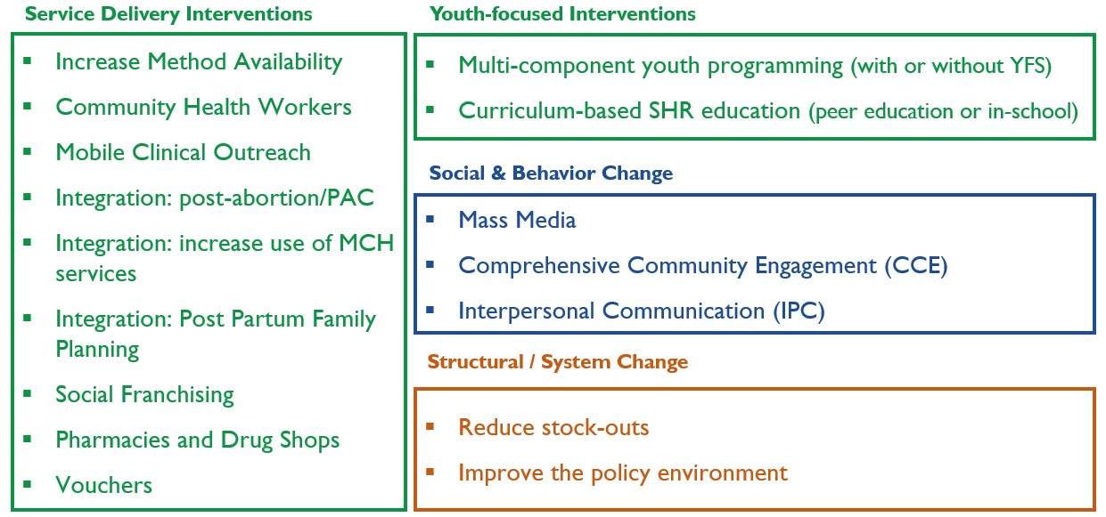 - Based on global evidence on the effectiveness of various types of FP interventions, the impact of the coverage on mCPR growth is projected.