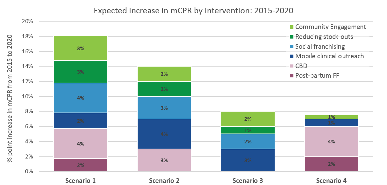 - This process of defining scale-up and projecting mCPR growth is repeated to provide multiple scenarios, with varying levels of scale-up of existing programs and various options for implementation of new programs.